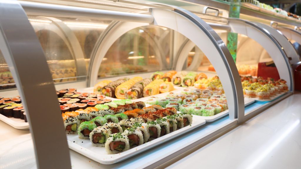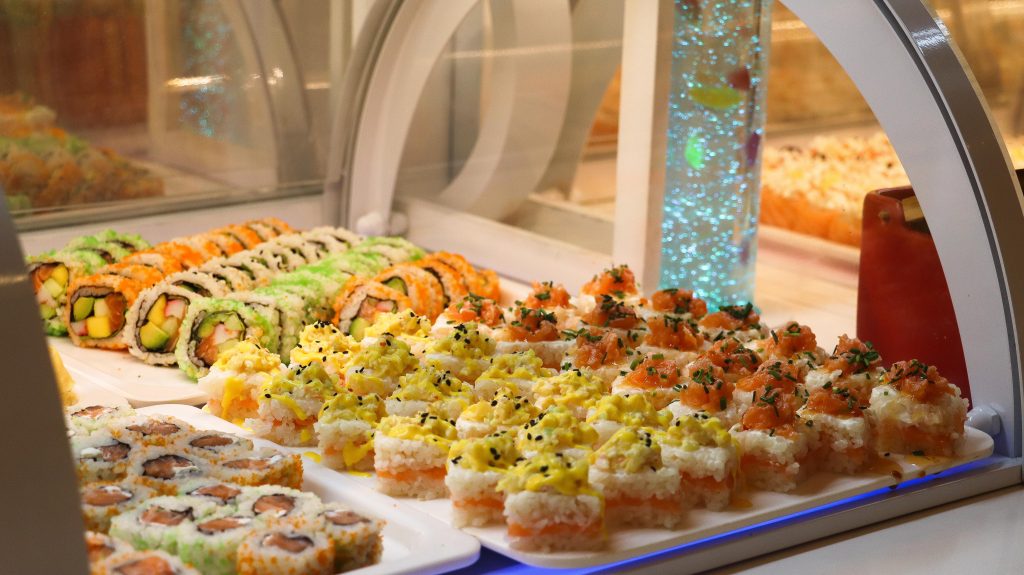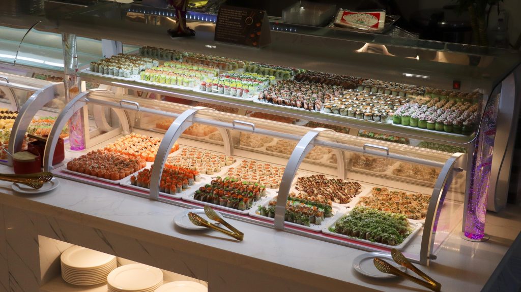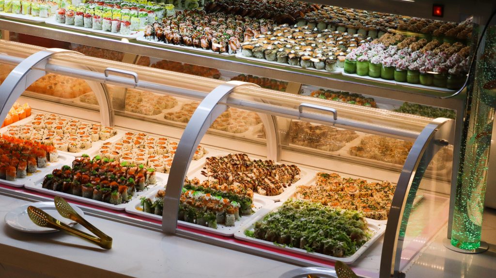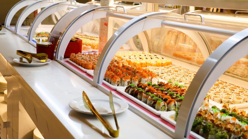 Buffet self-service à descrição de comida chinesa e japonesa.