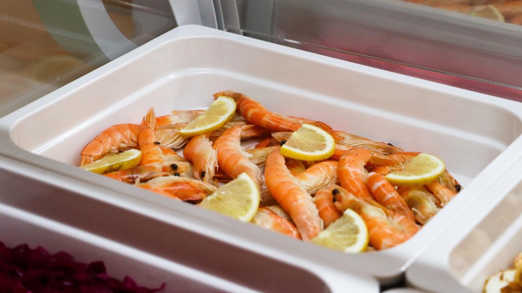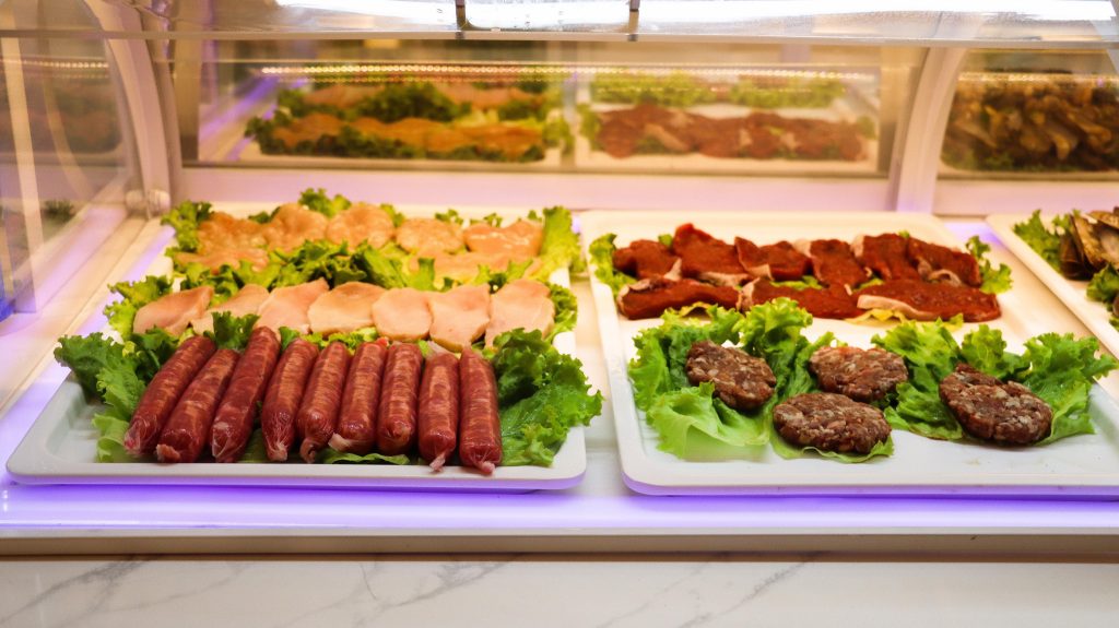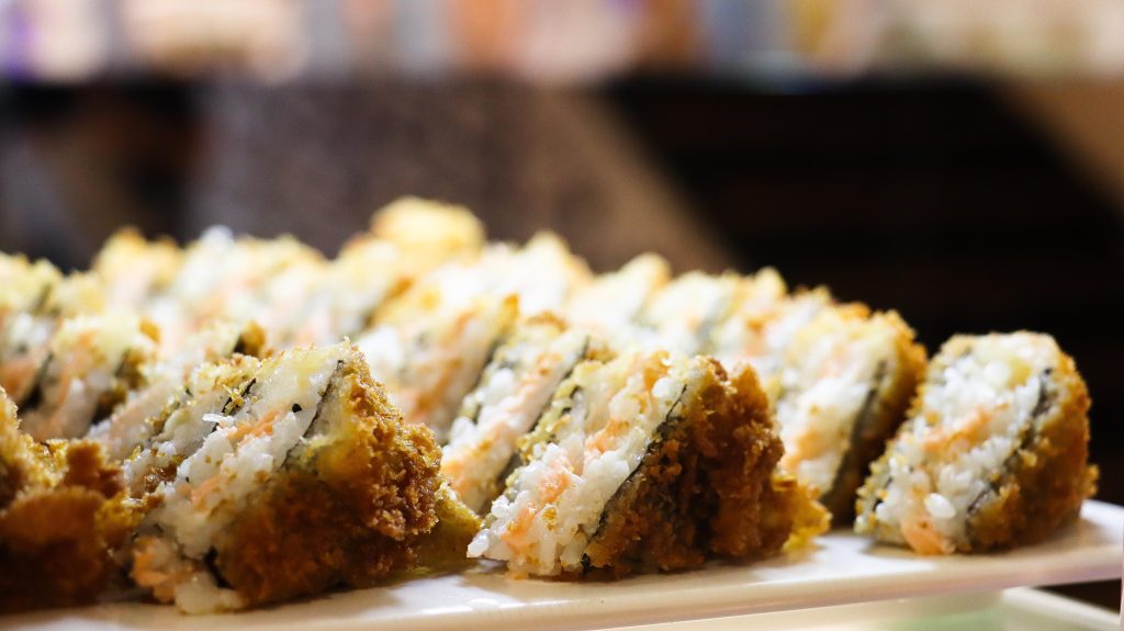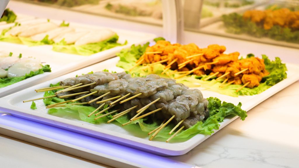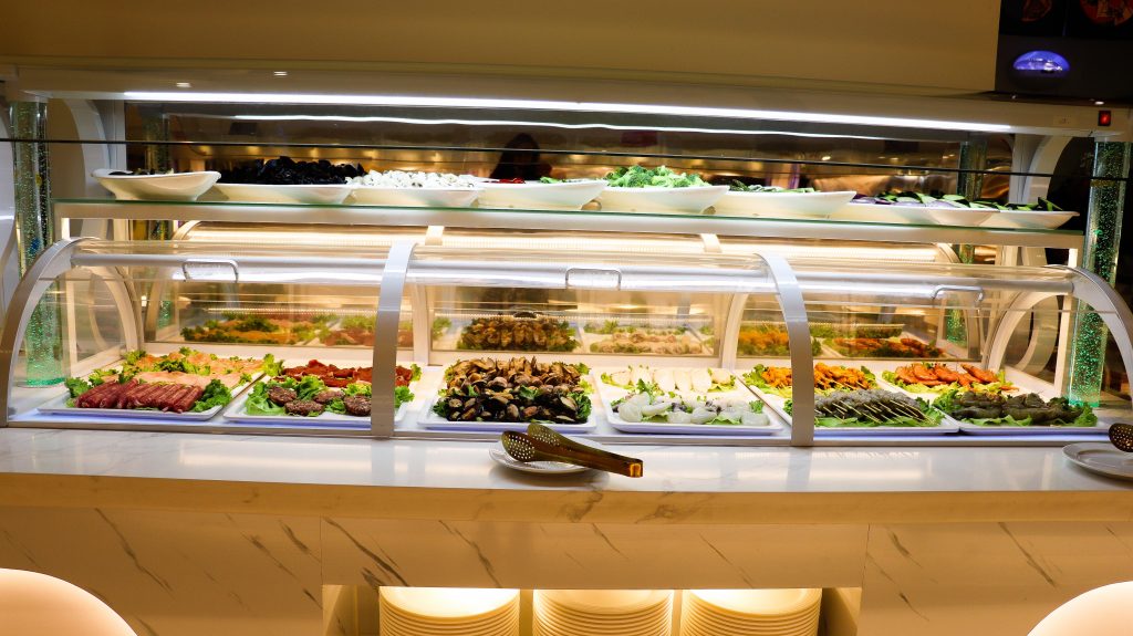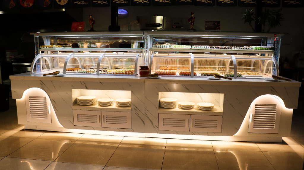 Buffet self-service à descrição de comida chinesa e japonesa.